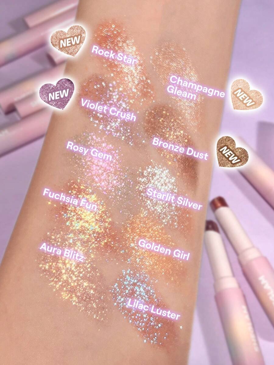 Aura Blitz, Bronze Dust, Champagne Gleam, Fuchsia Fun, Golden Girl, Lilac Luster, Rock Star, Rosy Gem, Starlit Silver, Violet Crush