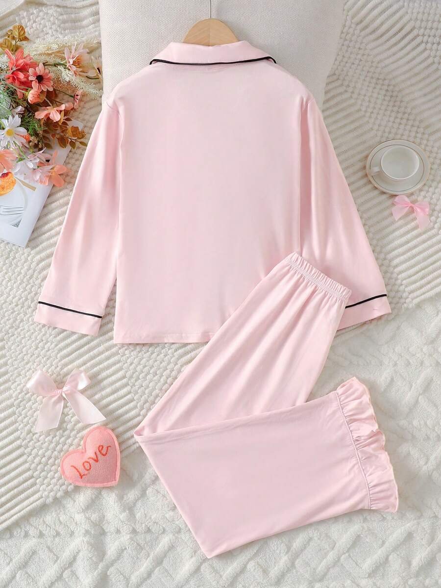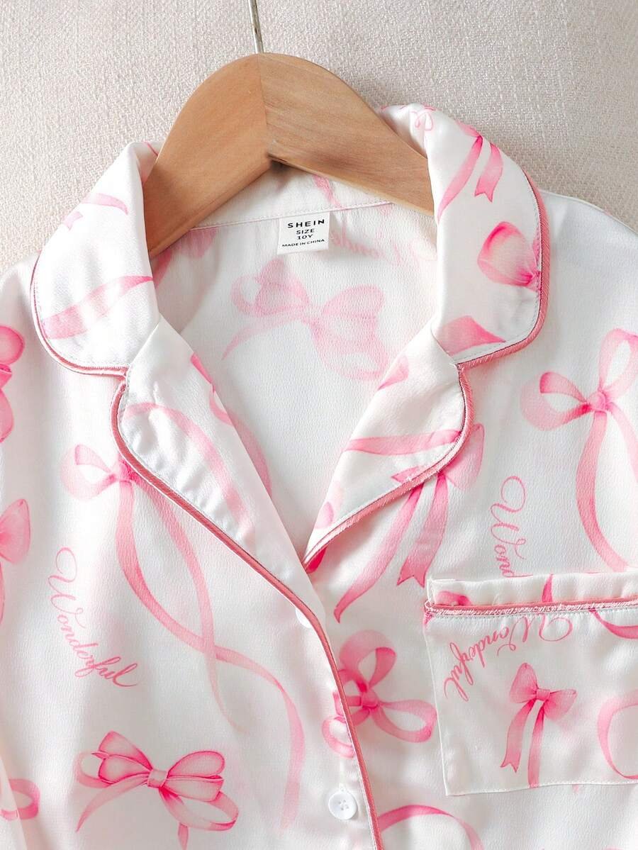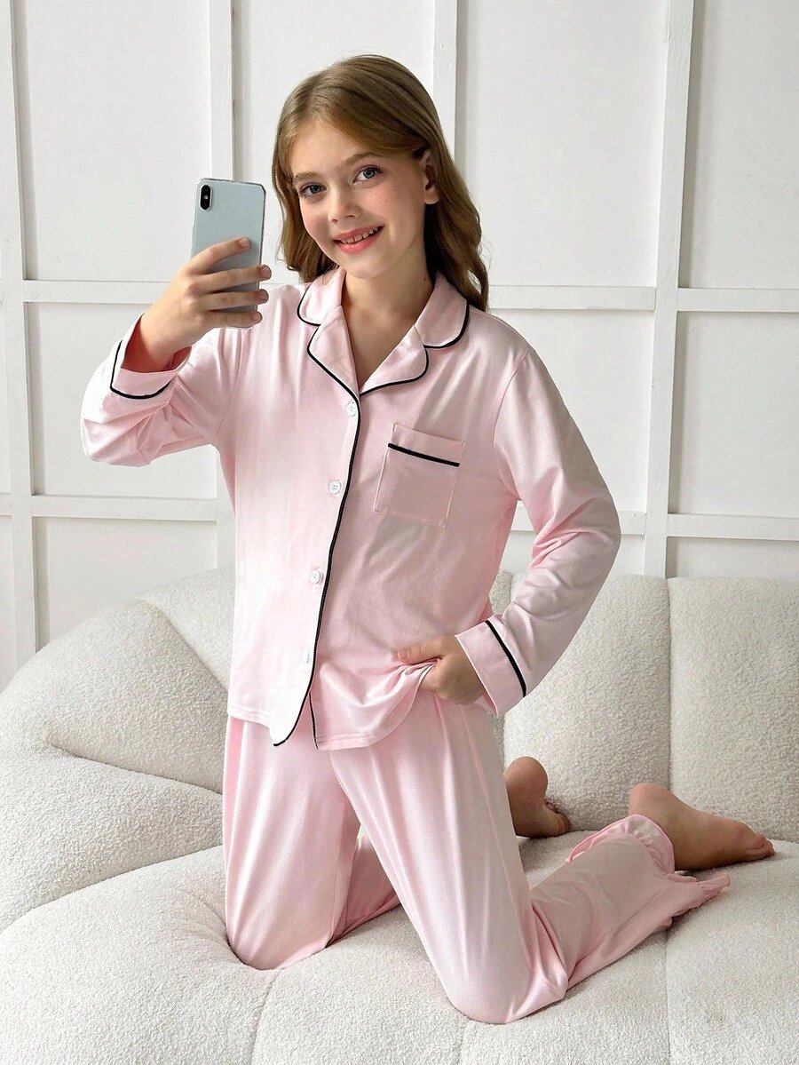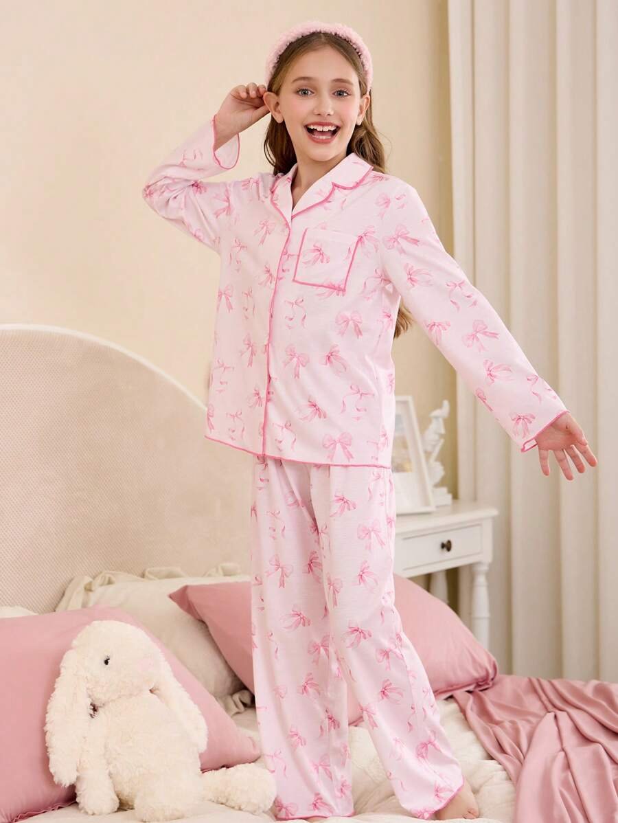 SHEIN مجموعة بجامة كاجوال قطعتين للبنات المراهقات المكونة من توب بأكمام طويلة وبنطال مع جيب منصهر مزين بالفيونكة على الياقة بتصميم بسيط باللون الوردي (يباع كل مجموعتين بشكل منفصل)