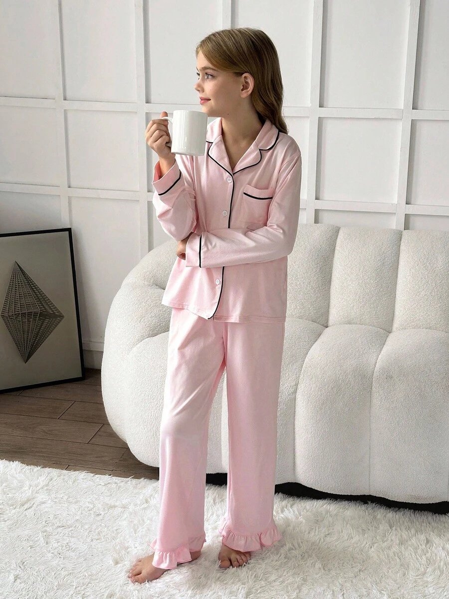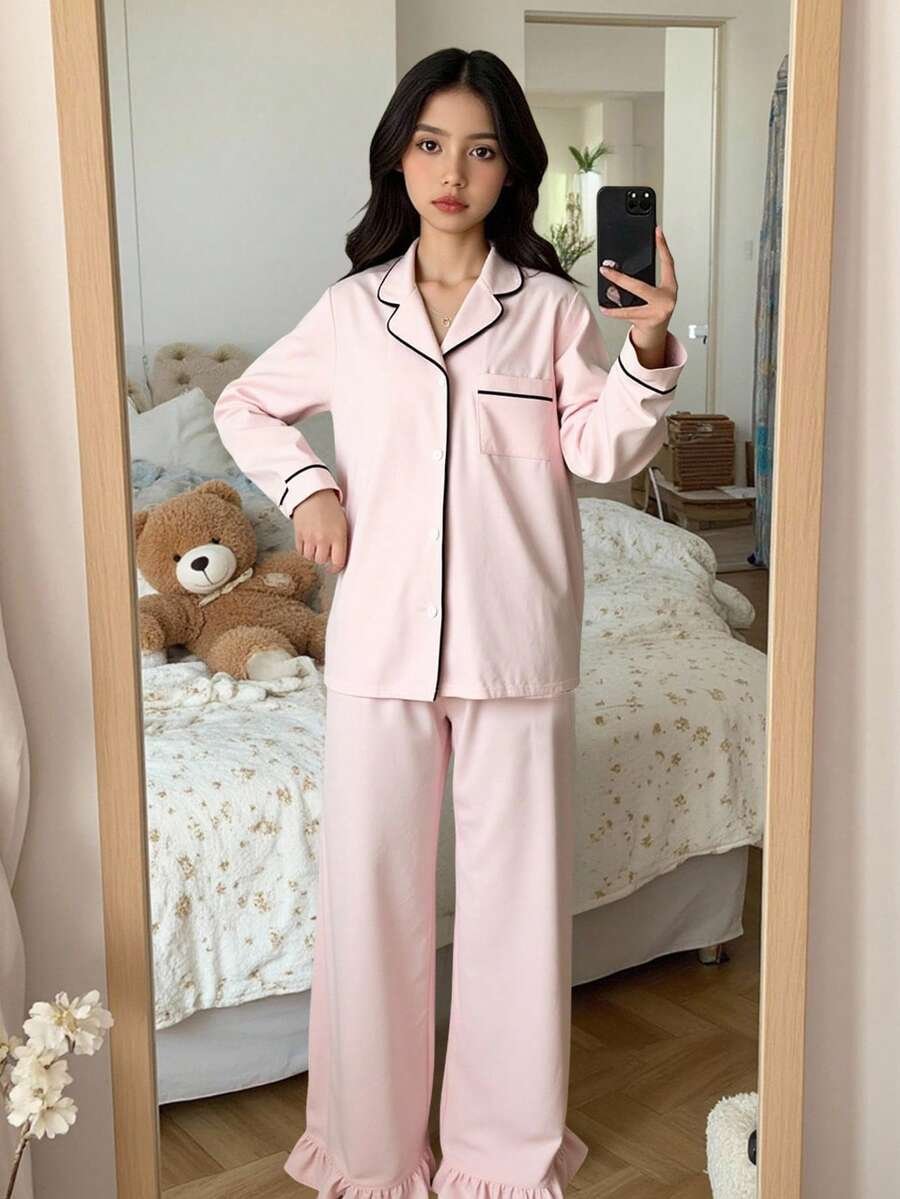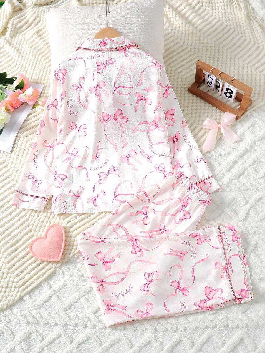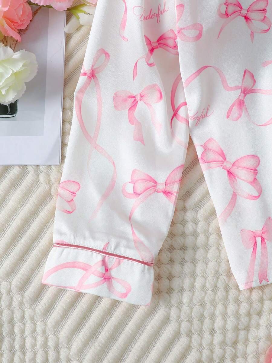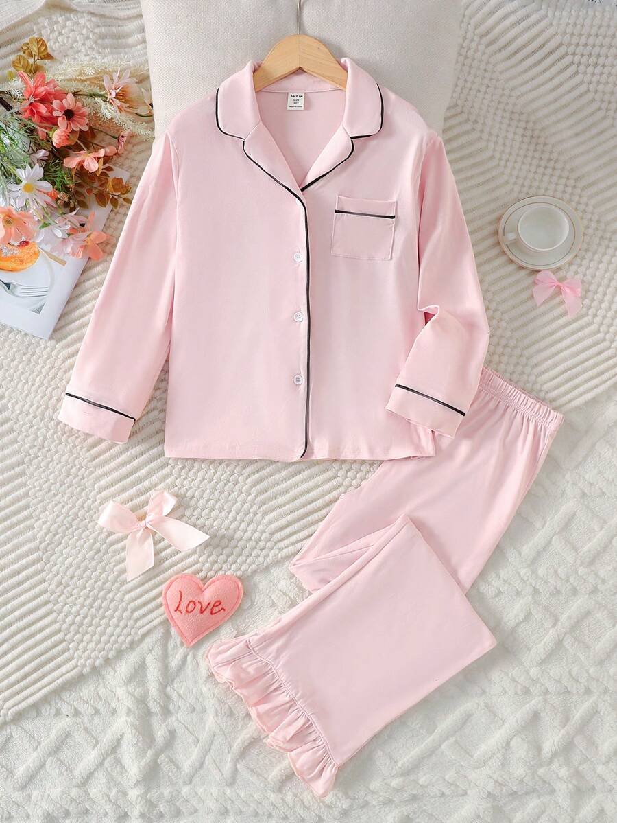 SHEIN مجموعة بجامة كاجوال قطعتين للبنات المراهقات المكونة من توب بأكمام طويلة وبنطال مع جيب منصهر مزين بالفيونكة على الياقة بتصميم بسيط باللون الوردي (يباع كل مجموعتين بشكل منفصل)