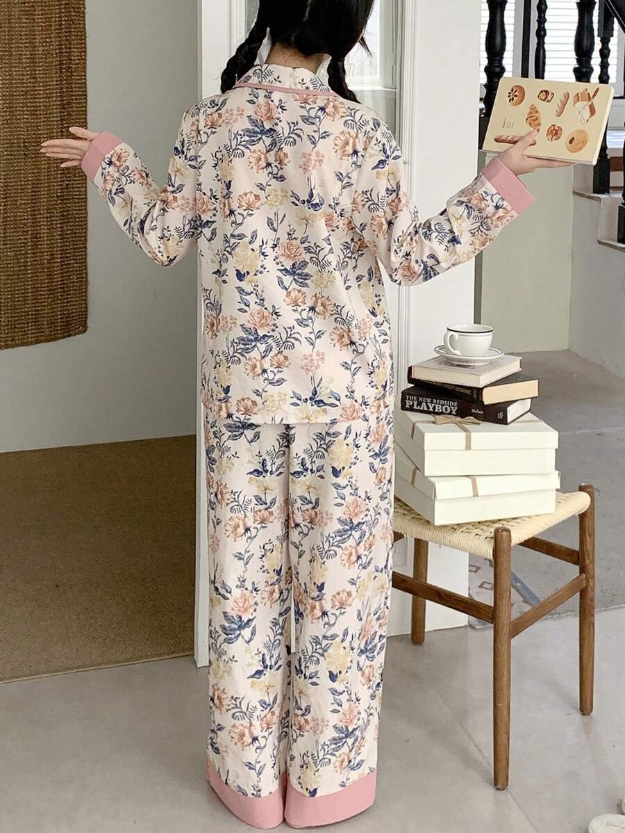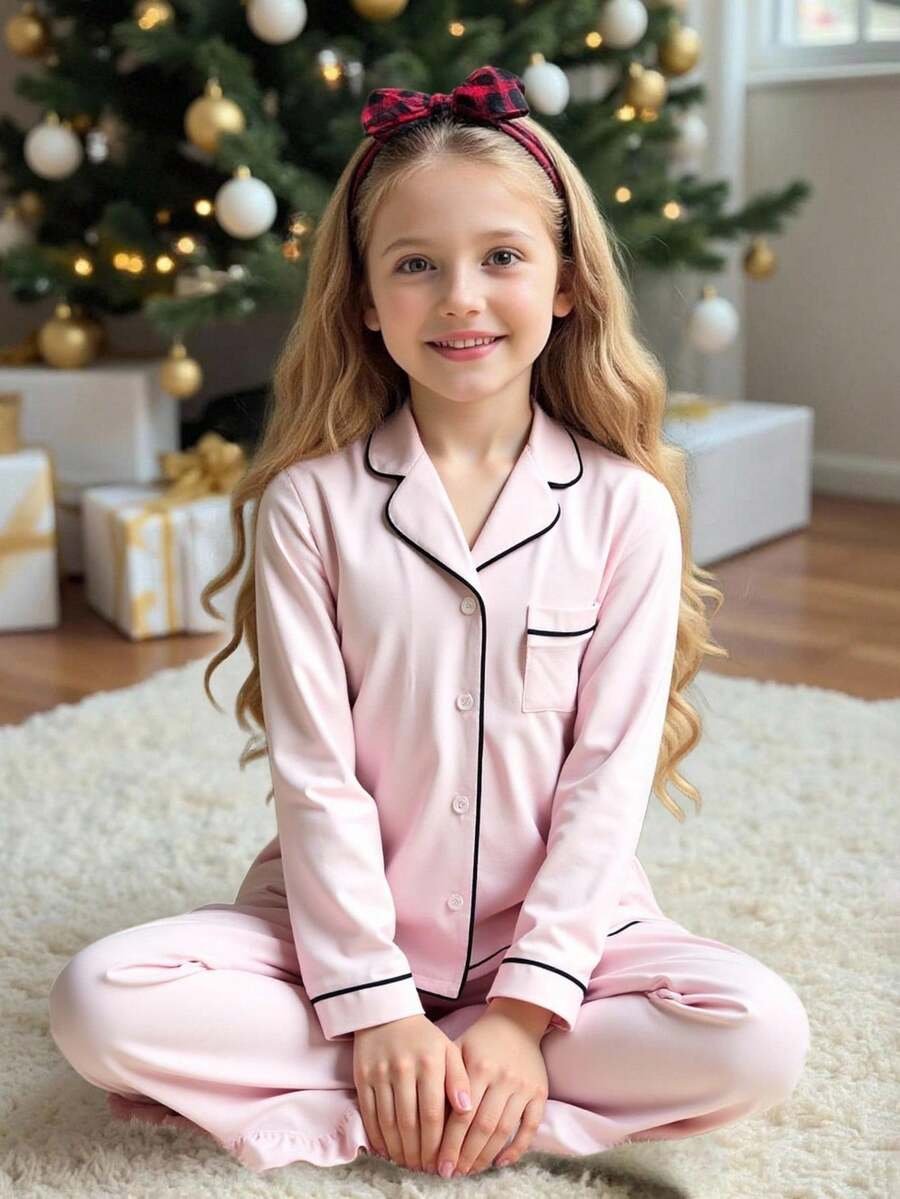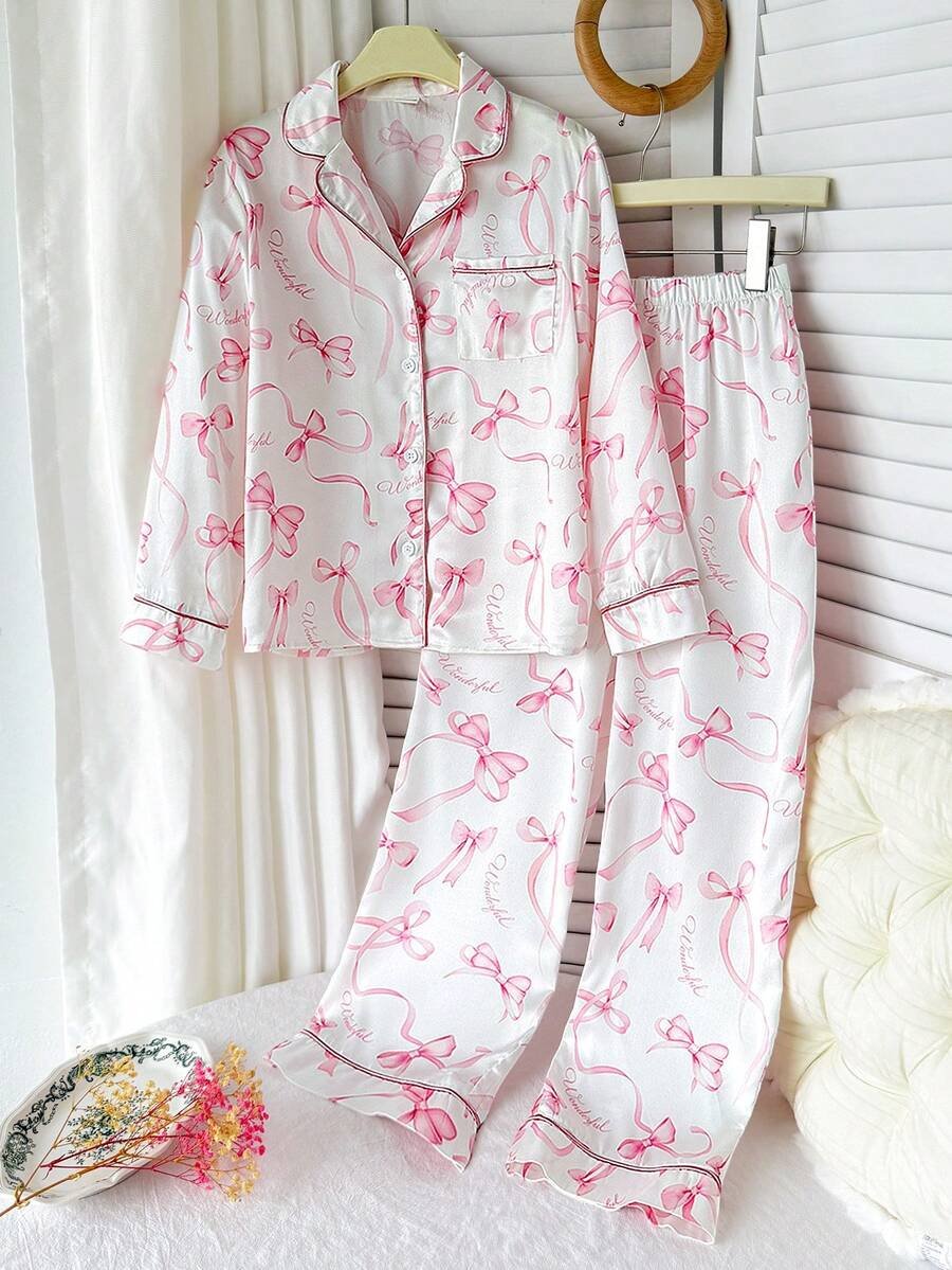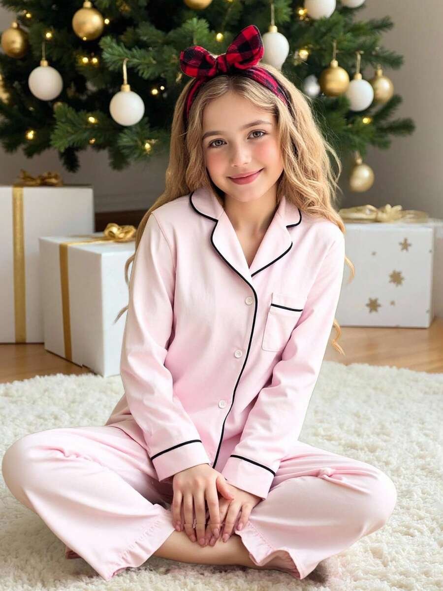 SHEIN مجموعة بجامة كاجوال قطعتين للبنات المراهقات المكونة من توب بأكمام طويلة وبنطال مع جيب منصهر مزين بالفيونكة على الياقة بتصميم بسيط باللون الوردي (يباع كل مجموعتين بشكل منفصل)