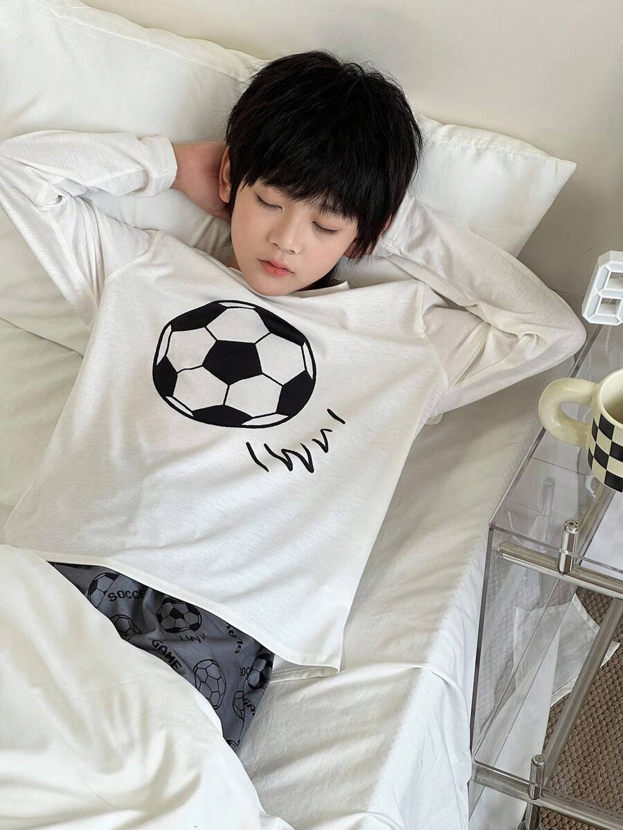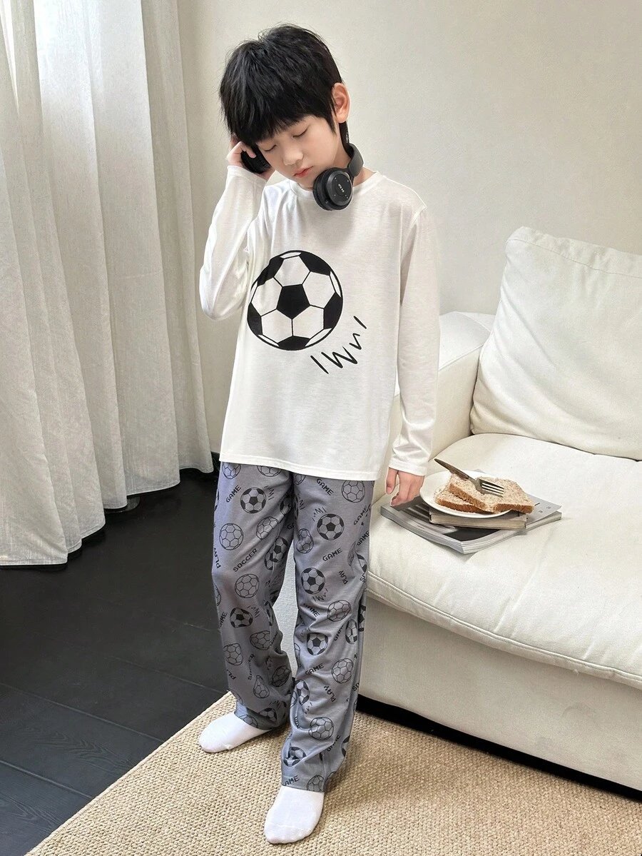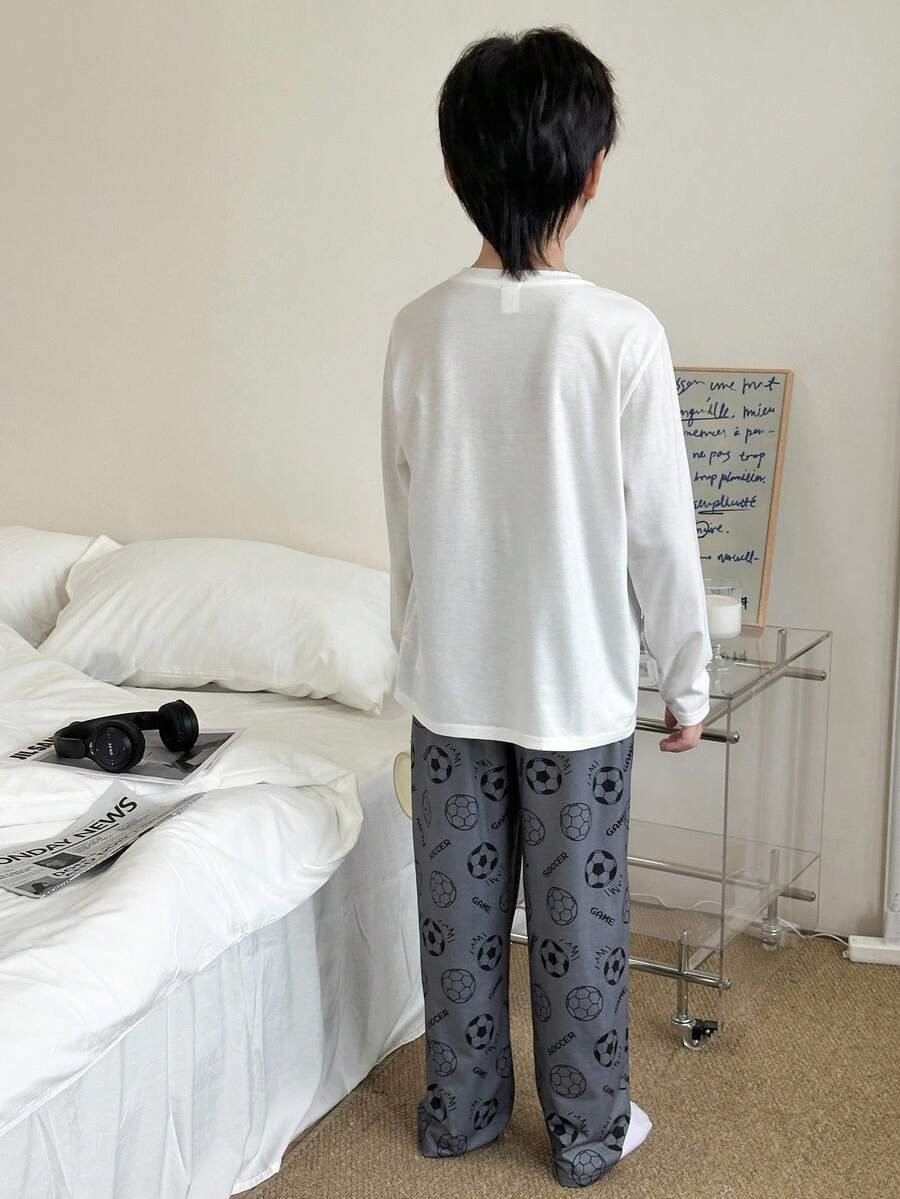 SHEIN مجموعة بيجاما لأطفال/مراهقين من الأولاد تتكون من 2 قطعة، ملابس علوية بياقة مستديرة وأكمام طويلة مع طباعة رياضية كاجوال وبنطلون
